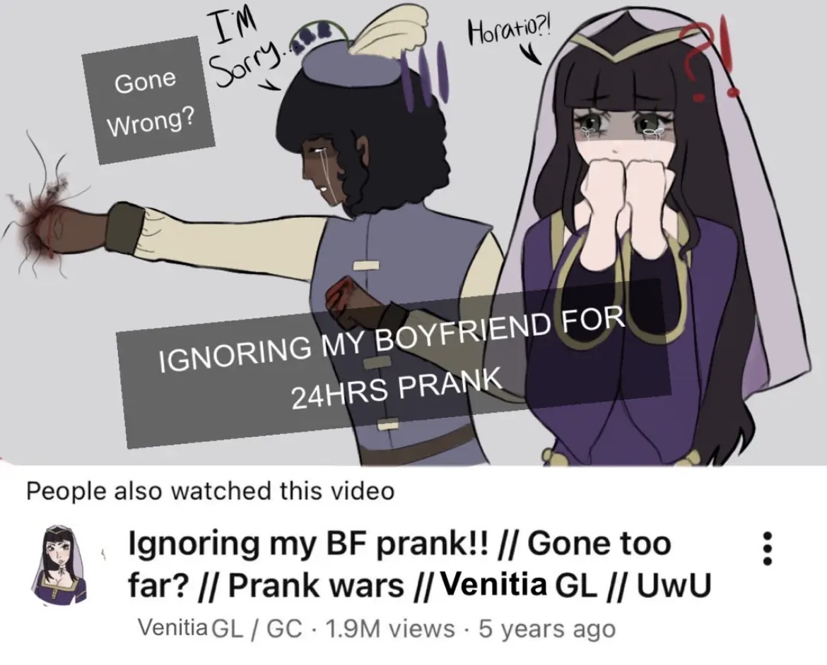 This is the shrine for my yumeship/oc x canon, including my self-insert, Venita and Horatio from the play Hamlet! They're also reffered to as Horentia or SerpentQuill if yall wan't an "official" ship name. In this continuation/adaptation/shit that I maladapive daydream to, After... Hamlet happens, Horatio wanders alone lost and in need of connection when he stumbles upon Venita hanging out in the woods. Confused on why she's there, the two talk for a bit and eventually form a bond, Horatio learns to accept his greif over Hamlet, she learns the philosophy of stoicism might not be all its cracked up to be, and the two elope in Spain.